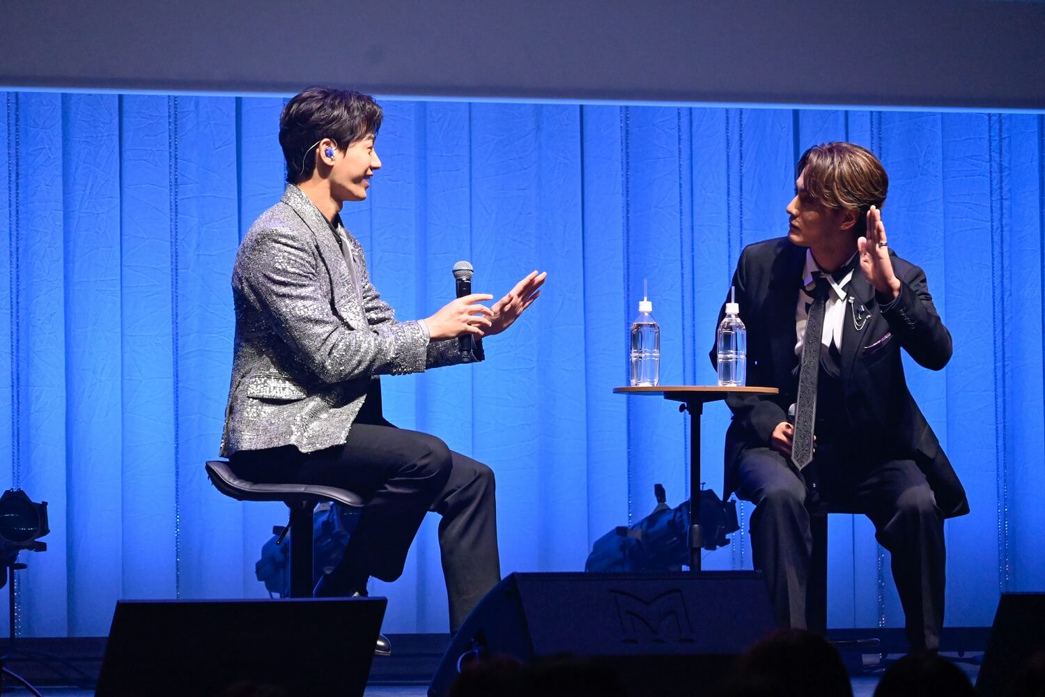 イベント開催時はミュージカル『マタ・ハリ』公演中で、加藤さんはイベント前日もマチネでラドゥー役、ソワレでアルマン役を演じるという超人ぶり! そしてキム・ソンシクさんも韓国で創作ミュージカル『レッド・ブック』に出演中の合間を縫って来日してくださいました。満員のお客様が期待の熱視線を向けるなか、オープニング映像に続いてお二人が登場。前奏が流れるや、加藤さんが韓国語で台詞をつぶやいて……! そしてお二人による『MAN TO MAN』(『マタ・ハリ』より)の迫力のデュエットが始まりました。間奏でも韓国語の台詞が飛び交って、まるで一本のミュージカルを観ているよう。会場内は大興奮、スタートから一気にヒートアップです!
