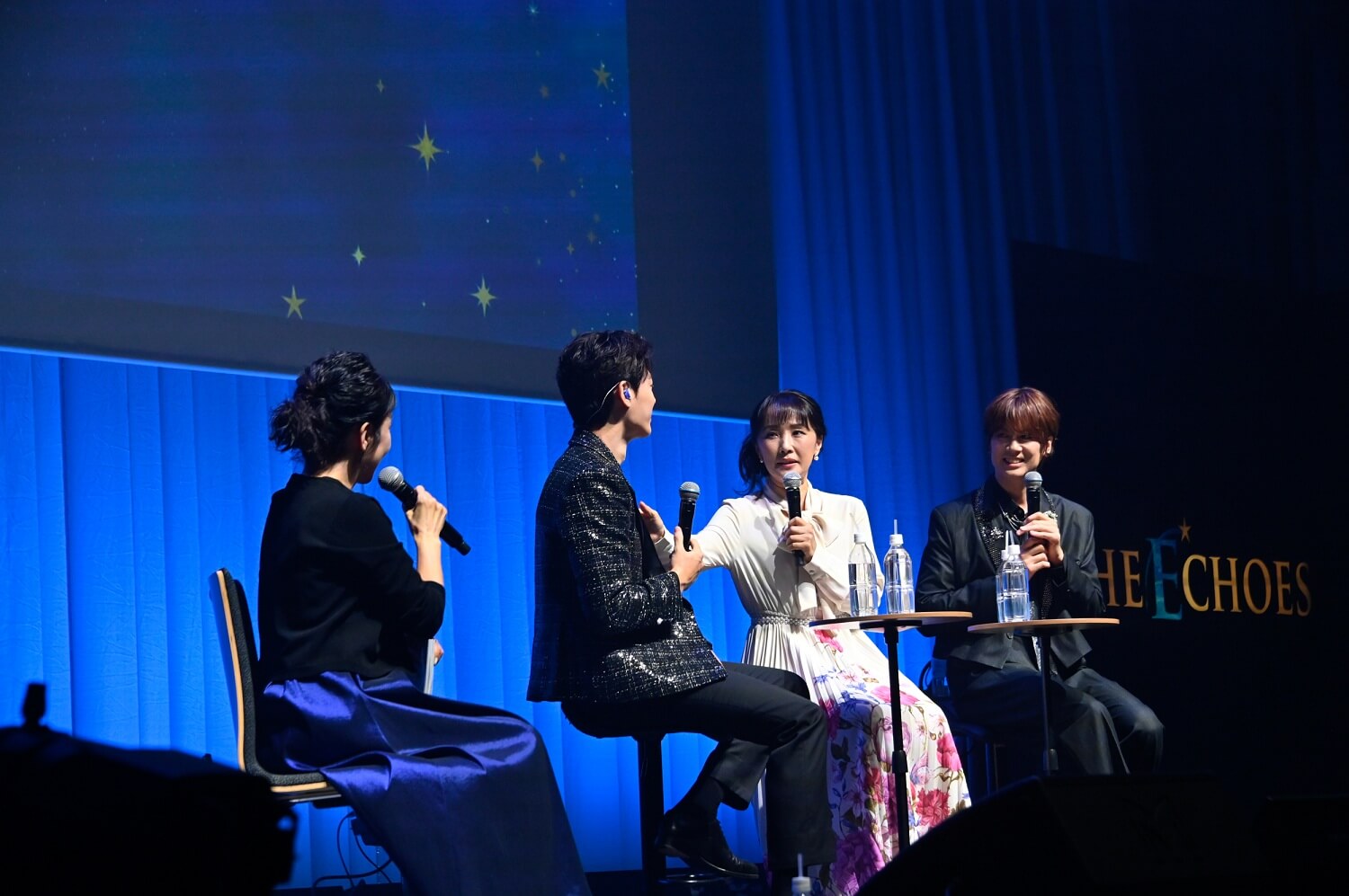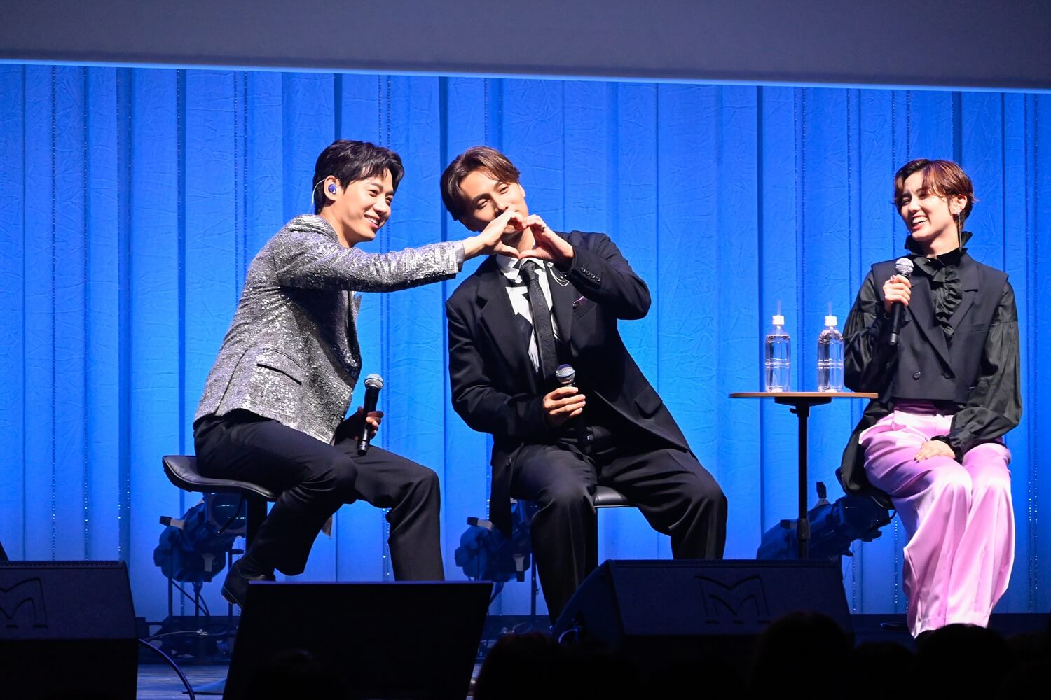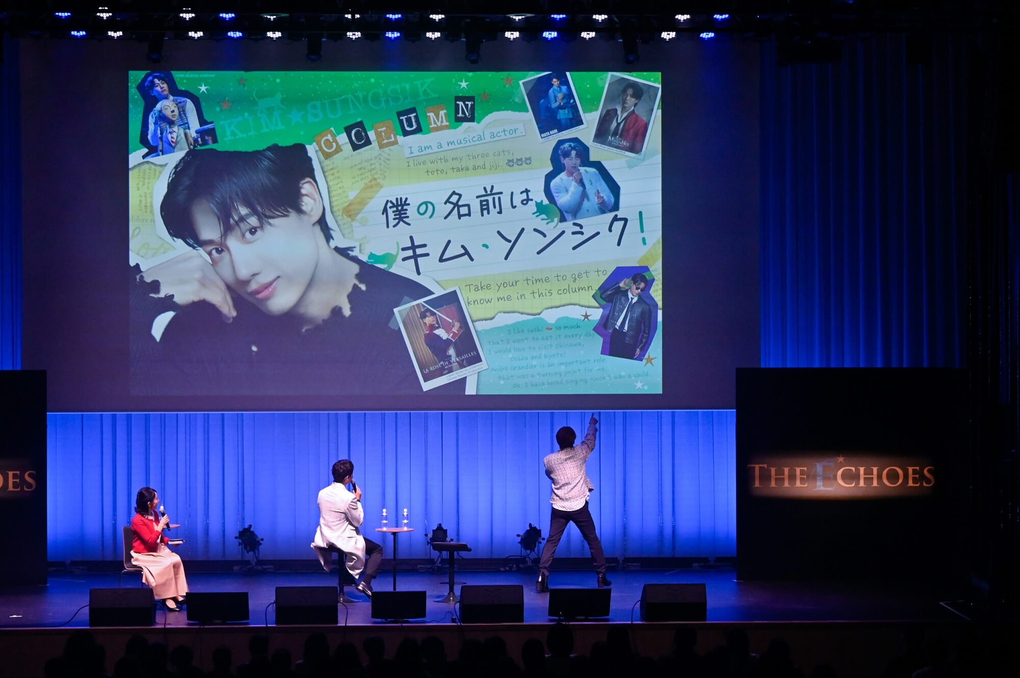 (左から)MC:キム・テイさん、キム・ソンシクさん、加藤和樹さん皆さん、それぞれに才能と個性豊かで、素晴らしい方々ばかりで…。加藤お兄さんは、初めてお会いした時とても強烈でカリスマを感じましたが、実はとても繊細で思いやりのある方だということがわかりました。彩風さんは、本当に「素敵」という言葉がぴったりの方。浦井お兄さんは、見た目も心も少年のようで、本当にユーモアにあふれた方でした。濱田お姉さんは、明るく上品で、豊富な経験からくる余裕で僕を優しく導いてくださり、とても感謝しています。